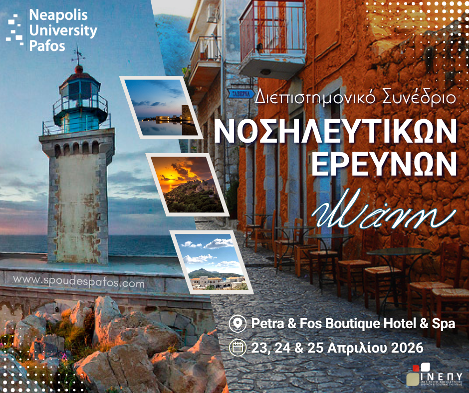 Η εταιρία StudyPlan και το Πανεπιστήμιο Neapolis Πάφου συμμετέχουν στο Διεπιστημονικό Συμπόσιο Νοσηλευτικών Ερευνών του Ινστιτούτου Υγείας που θα πραγματοποιηθεί στο Οίτυλο Μάνης, στις 23, 24 & 25 Μαϊου 2026.